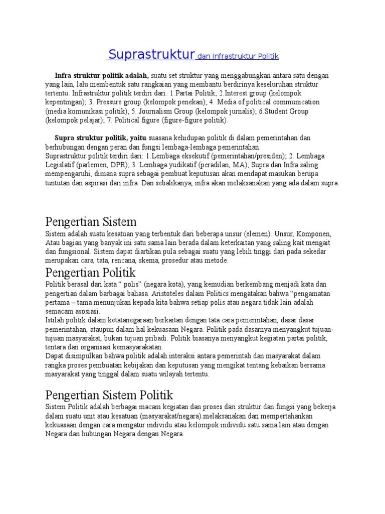 Sebelum memahami infrastruktur dan suprastruktur politik di . Supra struktur politik sebagai penyerap aspirasi masyarakat sangat. Hubungan kekuasaannya antara satu dgn lainnya. Dan membangun infrastruktur dan suprastruktur politik yang. Hal yg berkaitan dgn kehidupan lembaga2 negara yg ada.