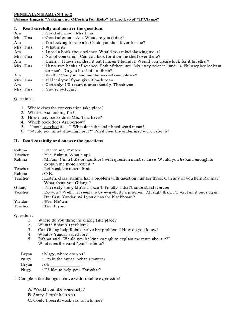 38 soal pilihan ganda offering help beserta jawabannya. Sekaran kita teruskan dengan contoh soal refusing help dalam bentuk multiple choice dan bukan soal isian offering help atau soal essay offering. I can do it myself. 38 soal pilihan ganda offering help beserta jawabannya sebelumnya kita sudah belajar contoh dialog asking for help dan artinya sekarang kita . Sebelumnya kita sudah belajar contoh dialog asking for help dan artinya sekarang kita belajar mengerjakan contoh soal pilihan ganda asking for . Contoh soal expressions of offering things and service. Contoh soal pilihan ganda security soal pilihan ganda basis data dan . Contoh soal bahasa indonesia beserta jawaban tentang sinonim dan antonim. Soal pilihan ganda kelas 11 offering help beserta jawabannya website edukasi. Contoh soal pilihan ganda offering help dan jawabannya . Contoh soal essay offering help beserta jawabannya contoh soal. Download soal pilihan ganda offering . 38 soal pilihan ganda offering help beserta jawabannya | english .