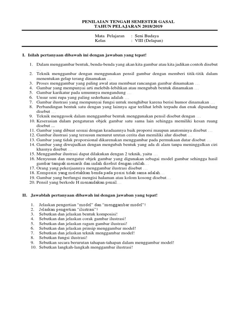 Kisi kisi soal uts semester ganjil seni . Pembahasan latihan soal pada artikel ini diharapkan bisa membantu siswa kelas 8 menghadapi uts pts semester 1 mata pelajaran seni budaya. Kumpulan contoh soal materi menggambar ilustrasi dilengkapi dengan kunci jawaban dalam mata pelajaran seni budaya kelas viii revisi terbaru. 50 contoh soal uts seni budaya kelas 8 smpmts dan kunci jawaban terbaru adik adik. Soal essay seni musik dan jawabannya.